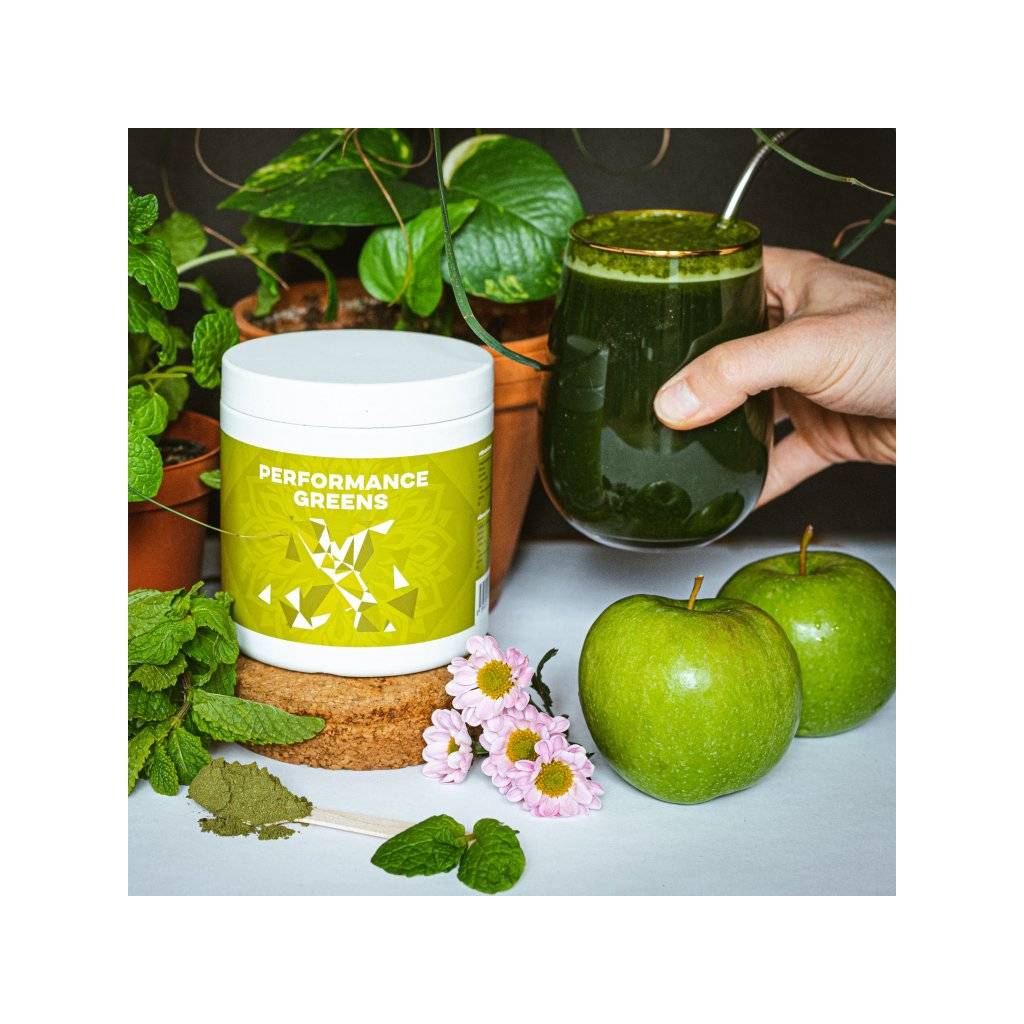 Performance Greens je směs super zelených rostlin pro podporu imunity2, energie2, trávení2, tvorbu hemoglobinu2, činnost srdce i jater2 detoxikace organismu2. Kromě zelených superpotravin obsahuje také Ashwagandhu. Adaptogen, který má vysoký obsah antioxidantů, posiluje organismus, podporuje funkce reprodukčního systému a koncentraci. Dalším nezanedbatelným pilířem Performance Greens pro remineralizaci organismu jsou elektrolyty obohacené o stopové prvky z mořských řas a karlovarské soli. Kromě vysokého obsahu vitamínů skupiny B, C, E a K, obsahuje Performance Greens také vysoké množství chlorofylu a vlákniny. Směs je bohatá na antioxidanty, které chrání naše buňky před oxidačním stresem. Zelené potraviny jsme doplnili o kurkumu, která působí také jako antioxidant a má pozitivní vliv na imunitní systém, trávení, játra, kardiovaskulární systém, nervovou soustavu, dýchací soustavu, stav kloubů, kostí a pokožky a duševní rovnováhu.